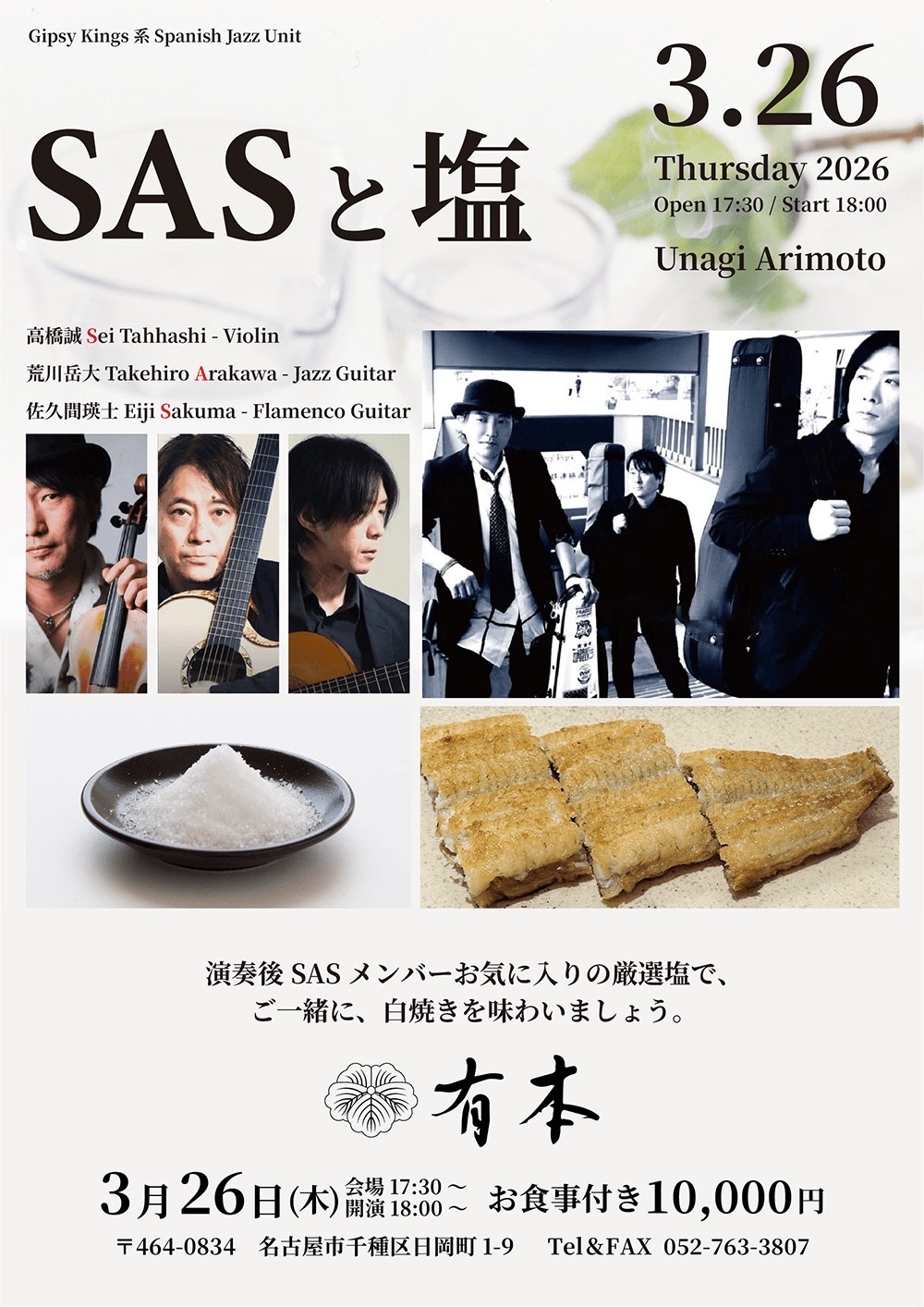 2026.3.26(木)開催 SAS Jazz Live『SASと塩』 Gipsy Kings 系 Spanish Jazz Unit『SAS』Jazz Live ! SASと塩 演奏後 SAS メンバーお気に入りの厳選塩で、ご一緒に、白焼きを味わいましょう。 開催案内 日 時2026年3月26日(木)17:30開場 18:00開演 出 演高橋誠(Violin)、荒川岳大(Jazz Guiter)、佐久間瑛士(Flamenco Guitar) 会 場うなぎ有本 会 費10000円(税込)*お食事付き ご予約(TEL / FAX)052-763-3807