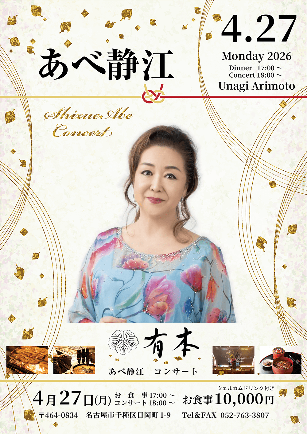 NEW 2026.4.27(月)開催 あべ静江 コンサート 開催案内 日 時2026年4月27日(月) 17:00(お食事)/18:00(コンサート) 出 演あべ静江 会 場うなぎ有本 会 費10000円(税込)*お食事・ウェルカムドリンク付き ご予約(TEL / FAX)052-763-3807